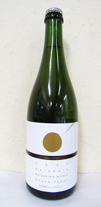 ラベルより「大阪府柏原市の自社農園で減農薬栽培されたエコ農産物の堅下本葡萄を使用し、柔らかな香りとほど良いコクのあるワインに仕上げました。」 樹齢30年以上 白辛口